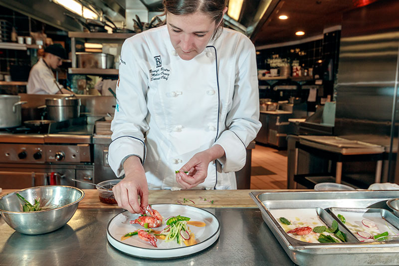 Chef Cumming’s take on a Tuna Niçoise lifts a sometimes-stodgy standard into something bright with a judicious punch of citrus. Skinned heirloom tomatoes add a silky texture to this pleasing plate featuring purple potatoes, pea shoots, green beans and English peas with tender slices of done-just-right Albacore tuna, a perfectly cooked egg, scattered toasted pumpkin seeds for a nuanced crunch and, of course, a delicious yuzu dressing. There’s no pondering what to pair with this summer sensation, though. “I’m all about rosé at the moment,” Cumming says. “It’s such a great summer sipper.”