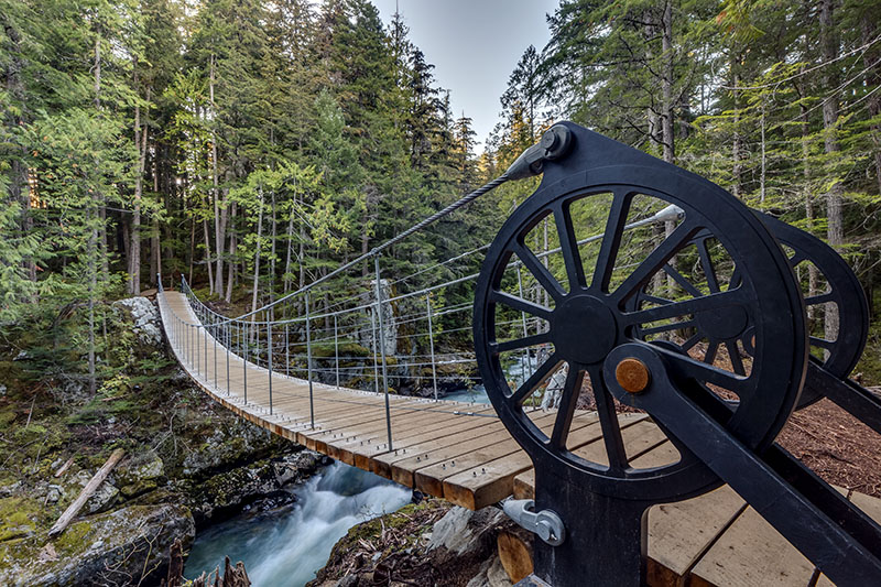 Cheakamus Crossing, opposite Function Junction on the east side of Highway 99, is home to the Whistler Interpretive Forest, an area that includes several excellent, moderate-distance hikes, as well as the trailhead for the popular Train Wreck Trail. The latter incorporates a suspension bridge that crosses the roaring Cheakamus River, and on the other side, there’s an old train wreck that’s renowned for its colourful and unique graffiti. The out-and-back trail is 5 kilometres long and rated as easy.