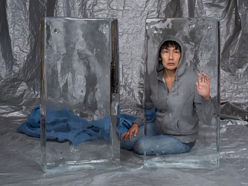 The photograph “mother” shows a woman wearing a grey hoodie, sitting behind two blocks of clear ice. She represents the mother of Neil Stonechild, a Saulteaux First Nations teenager who was dropped off and abandoned in a field by police on the outskirts of Saskatoon. Overnight, temperatures dropped to -28C. Stonechild froze to death, and the tragedy is reflected through a mother’s anguish over her loss.