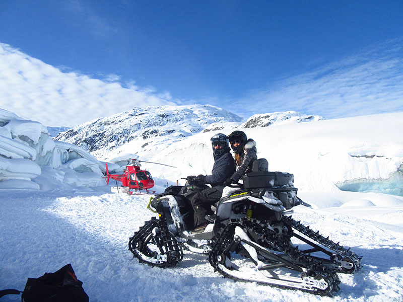 Head-Line, founded in 2006, is one of a small group of companies specializing in wintertime flightseeing in and around the Sea to Sky Corridor. Among the company’s tours, many of which include the chance to ride snowmobiles, snowbikes (half-track motorcycles), a snowcat or “monster-track” ATVs from the helicopter landing zone, is one that visits a crystal blue ice cave.