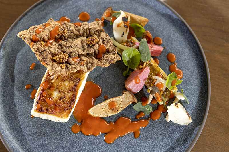 “The Fregola Sarda is a pasta from Sardinia, basically the step between pasta and couscous. We cook it with cheese and butter,” explains Surowy. The pasta and beets come from an old- favourite creation at sister-restaurant Caramba. “I thought they’d go together, and I got great feedback, so when I was thinking about unique ingredients, that stuck out to me. It brings together what we do here: combining unique and interesting flavours which really pop with local ingredients and Italian methods and flavours.”